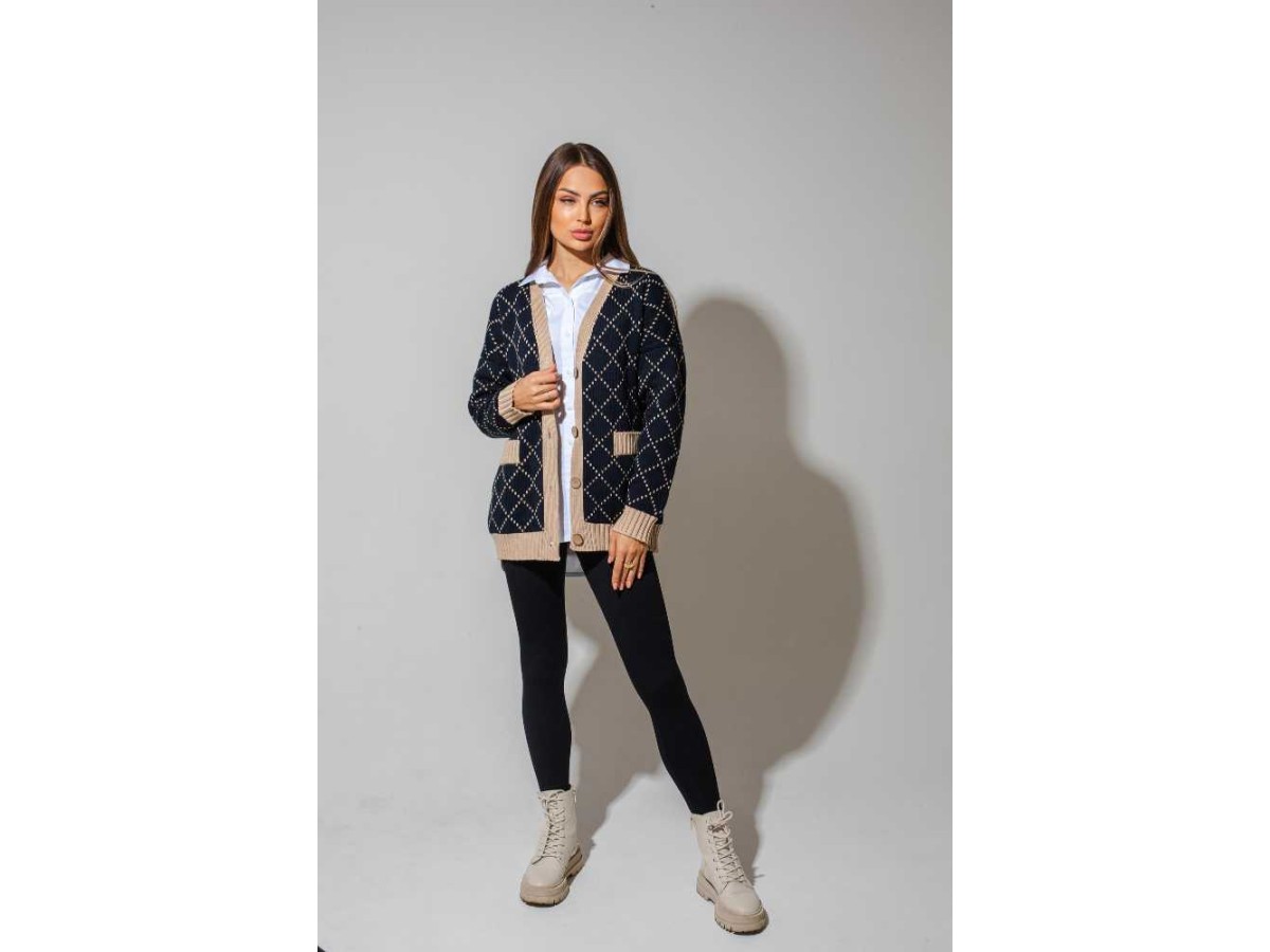 Этот женский кардиган - отличный пример того, как базовая вещь может быть не только практичной, но и стильной. Он выполнен из плотной трикотажной ткани, которая дарит комфорт и тепло в прохладные дни. Классическое сочетание тёмно-синего цвета с бежевой отделкой делает модель универсальной - её легко комбинировать с базовыми вещами гардероба: от джинсов и леггинсов до строгих брюк и платьев-рубашек.
